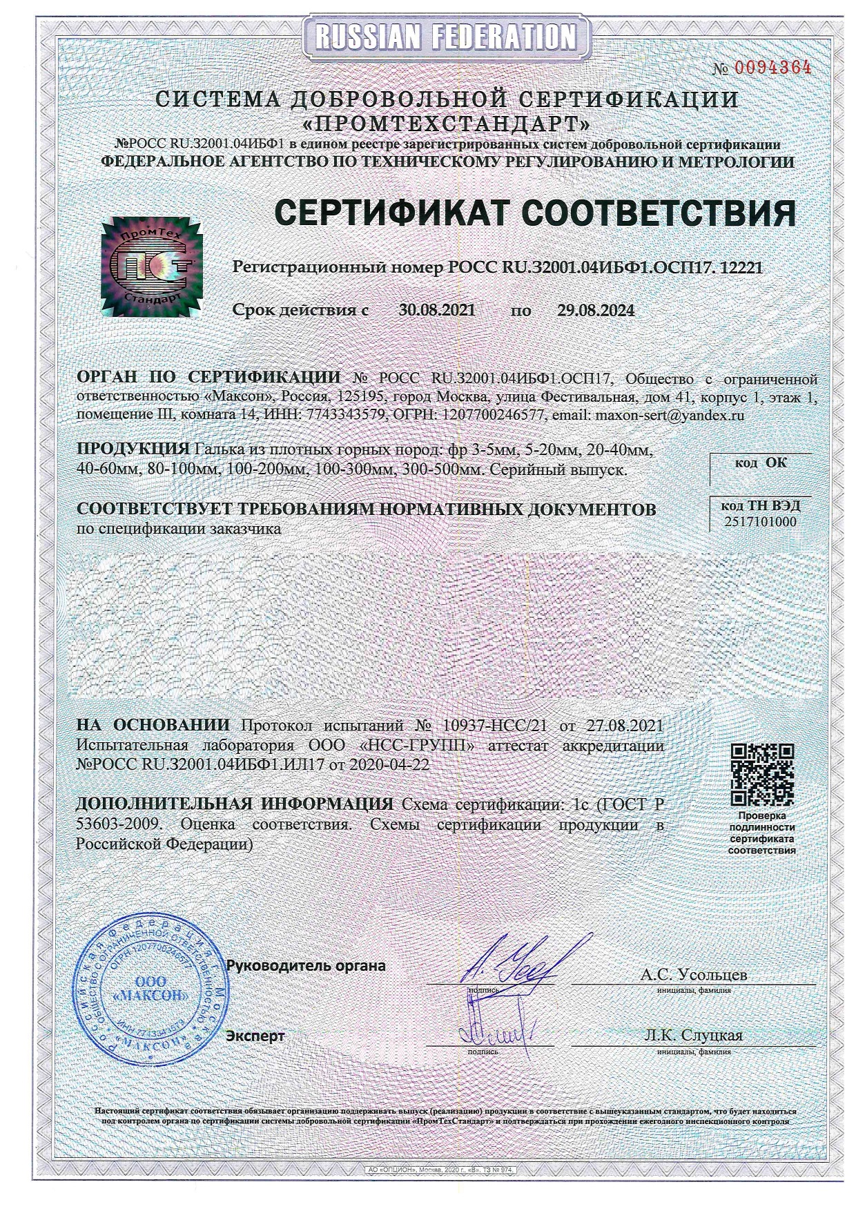 Сертификат соответствия на гальку крымскую